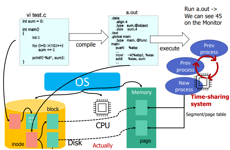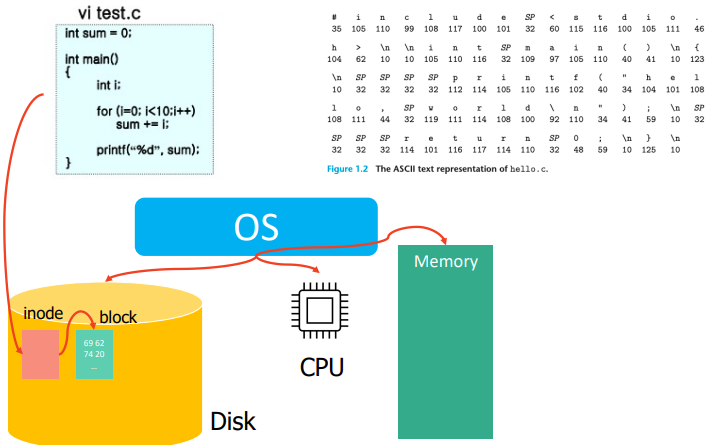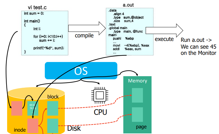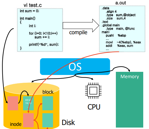 시스템 프로그램을 배우는 관점에서는 a.out 이라는 새로운 “파일”이 생겼으니 disk 상에서 변화가 있겠구나~ 하고 생각할 수 있다.