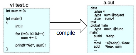 compile 과정 ($gcc) : .c (high-level) → .s (assembly) → .o (relocatable) → a.out (executable)