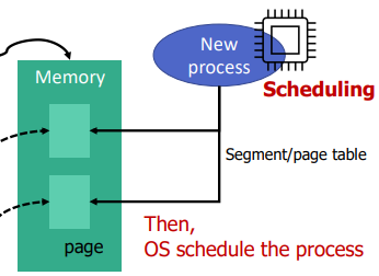 disk block(데이터)을 메모리 상에 올리고서는 process를 만들어줘야 한다. 프로세스는 수행 중인(살아 움직이는, active object) 프로그램이다. process가 가지고 page들이 각각 어디에 있는지 관리할 때에는 page table을 사용한다. 운영체제는 프로세스를 스케줄링한다. (CPU 할당)