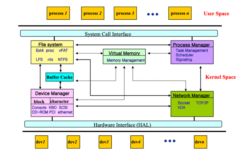 - Device Manager : 장치 관리 (block-HDD, character-키보드, 마우스)