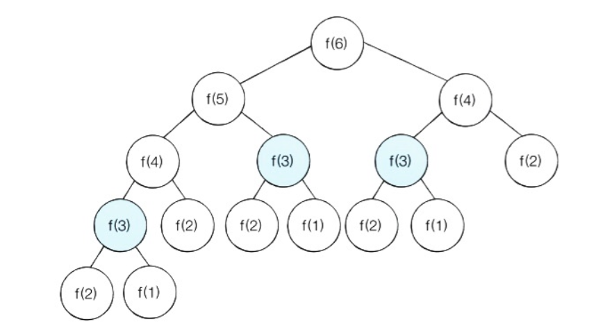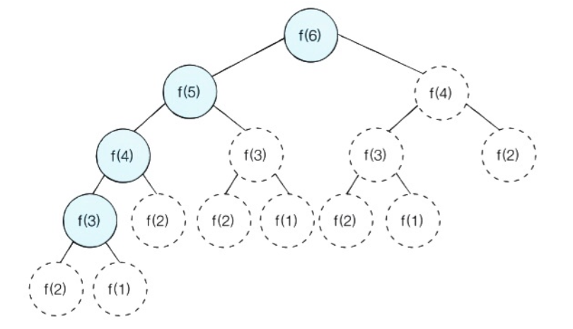 f(6)을 호출할 때에는 위의 그림처럼 색칠된 노드만 방문한다. 점선으로 표시된 부분은 사실상 호출되지 않는다. 왜냐하면 호출하더라도 따로 계산하지 않고 리스트에서 값을 가져오거나 바로 1을 반환하기 때문이다.