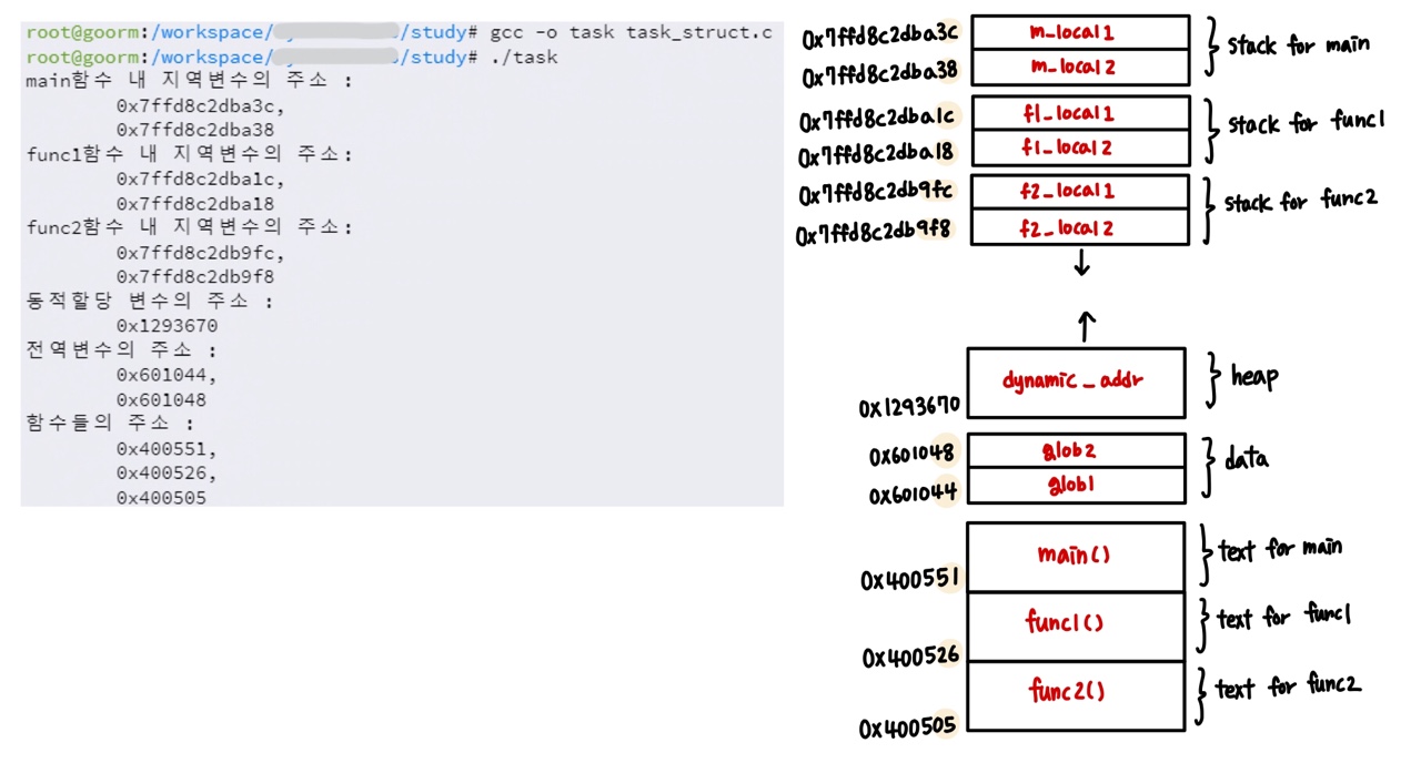 printf("func1함수 내 지역변수의 주소: \n\t%p, \n\t%p\n", &f1_local1, &f1_local2);