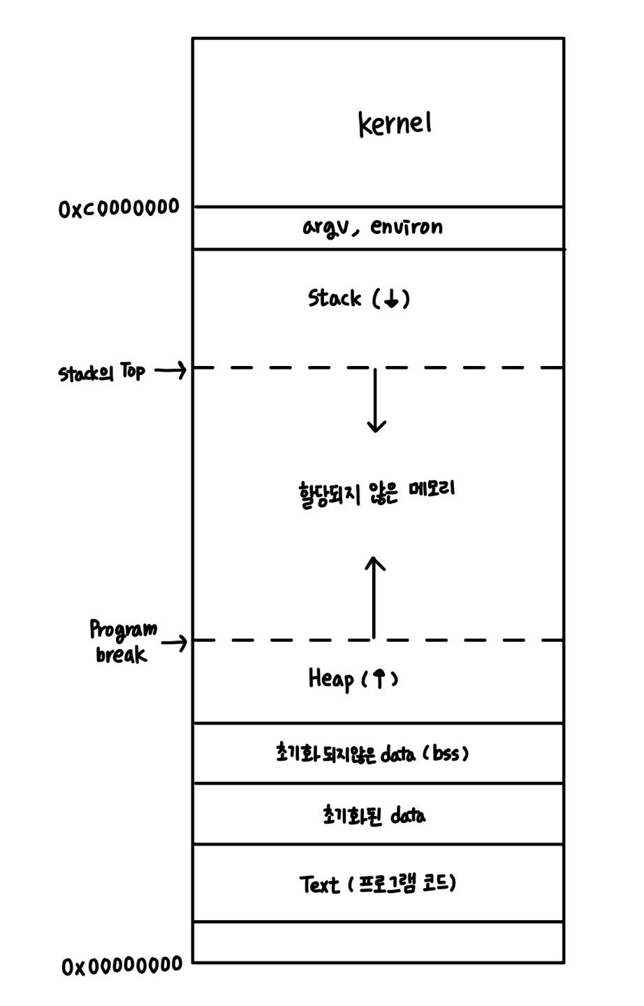프로세스에는 크게 text(code), data, heap, stack으로 영역이 나누어진다. 다음은 가상 메모리의 주소 공간을 나타낸 그림이다.