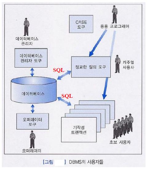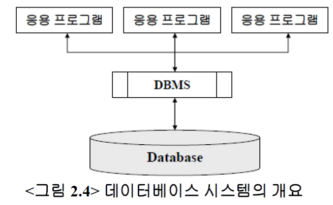 - 데이터베이스는 데이터의 대규모 저장소로서, 여러 부서에 속하는 여러 사용자에 의해 동시에 사용된다.