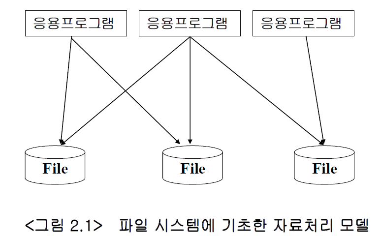 - 과거의 정보시스템에서는 개별 부서나 응용 프로그램에서 필요로 하는 데이터 파일을 각각 만들어 사용하는 일이 많았음