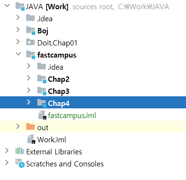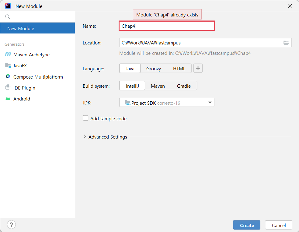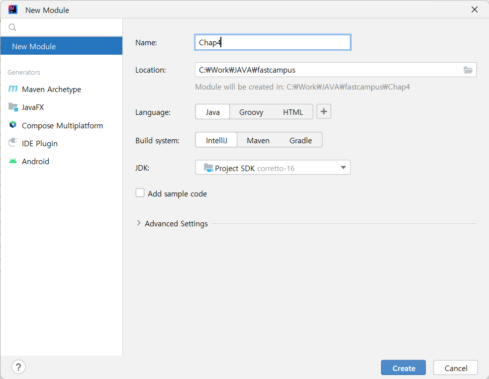 아래는 "C:\Work\JAVA\fastcampus" 위치에 "Chap4" 라는 이름의 새로운 모듈을 생성하고자 하는 상황이다.