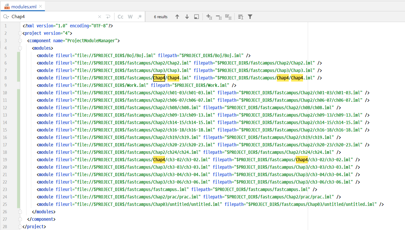 modules.xml 파일의 내용을 확인해보면 전에 만들었던 Chap4 모듈에 대한 정보들이 등록되어 있다. 이 정보들 때문에 새로 생성이 안되는 것이었다.