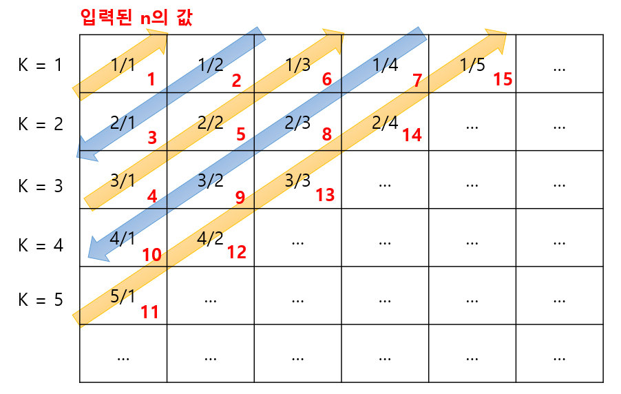 무한히 큰 배열에 다음과 같이 분수들이 적혀있다.